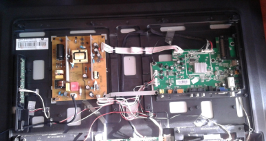 - Картинка транслируется с помехами ― полосами, рябью. Также могут искажаться цвета, пропадать четкость. Такие симптомы свидетельствуют о повреждении шлейфа матрицы ― он либо поврежден, либо окислился из-за попадания влаги. Необходимо заменить деталь. Полосы ― частый симптом повреждения матрицы. К сожалению, в этом случае ремонт нецелесообразен. Стоимость замены матрицы равноценна покупке нового ТВ.