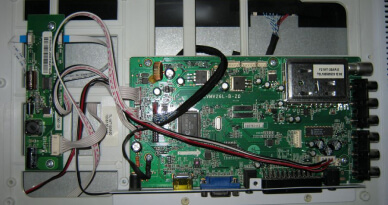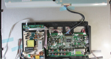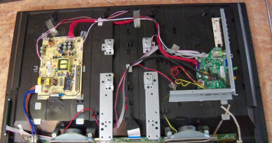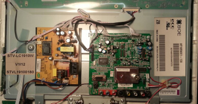 - ТВ отключается сам по себе или не включается. Вероятно, вышел из строя блок питания ― на плате вздулись конденсаторы, сгорели контакты или из-за скачка напряжения перегорел предохранитель. Если это возможно ― модуль чинят. Когда он сильно поврежден ― меняют. Также могут повредиться электроцепи. Провода прозванивают, затем неисправные участки паяют или меняют.